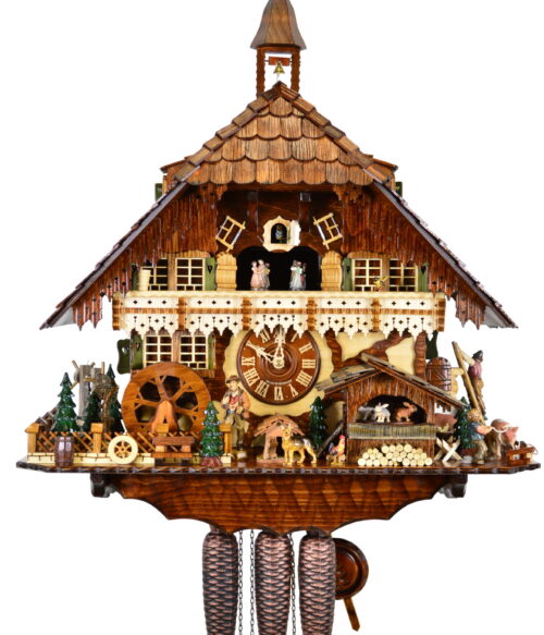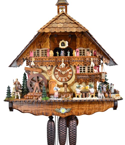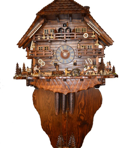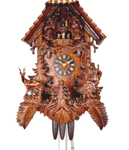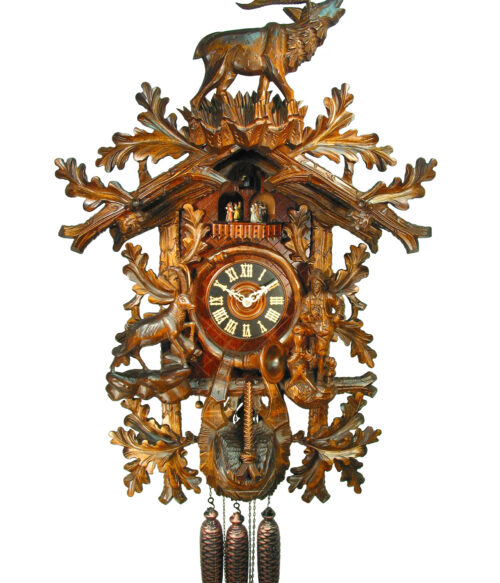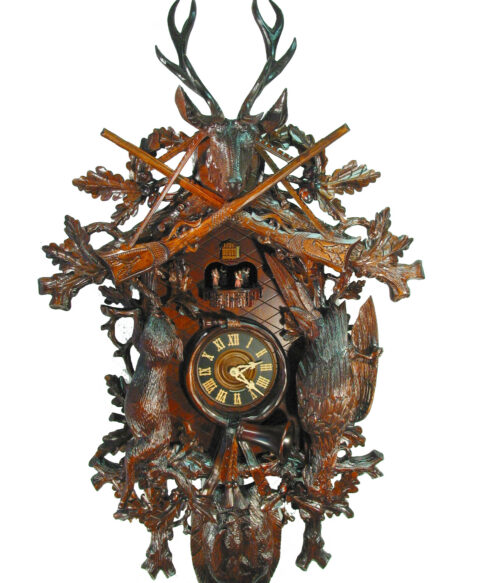Modellnummer: 5.0193.01.P August Schwer Schwarzwälder Kuckucksuhren. Dies ist eines der großes Jagdstücke in unserem Programm. Die Uhr hat ein 8-Tage Werk / Laufzeit (mechanisch) mit Musik- und Tänzer-Funktion. Dies ist ein traditionelles Jagdstück, aufwändig geschnitzt mit sehr plastisch ausgeformt. Die Uhr wird nach einem antiken Vorbild geschnitzt und dunkel nussbaumfarben gebeizt. Ganz klassisch hat die Uhr einen Dachaufsatz mit zwei Gewehren, Hirschkopf (Geweih komplett Holz), Jagdbeute rechts und links des Zifferblatts. Unter dem Zifferblatt findet sich der Pulverbeutel, dazwischen das Jagdhorn. Großzügigie Verzierung mit Eichenlaub. - 5 Jahre Garantie -
