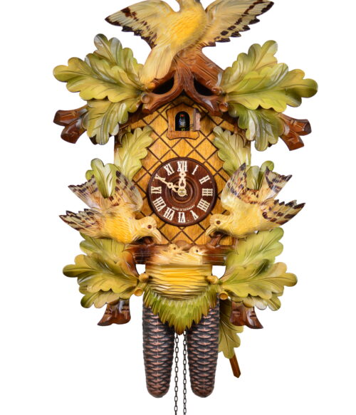 8-Tag Kuckucksuhr Schnitzerei Drei Vögel mit Nest, bemalt