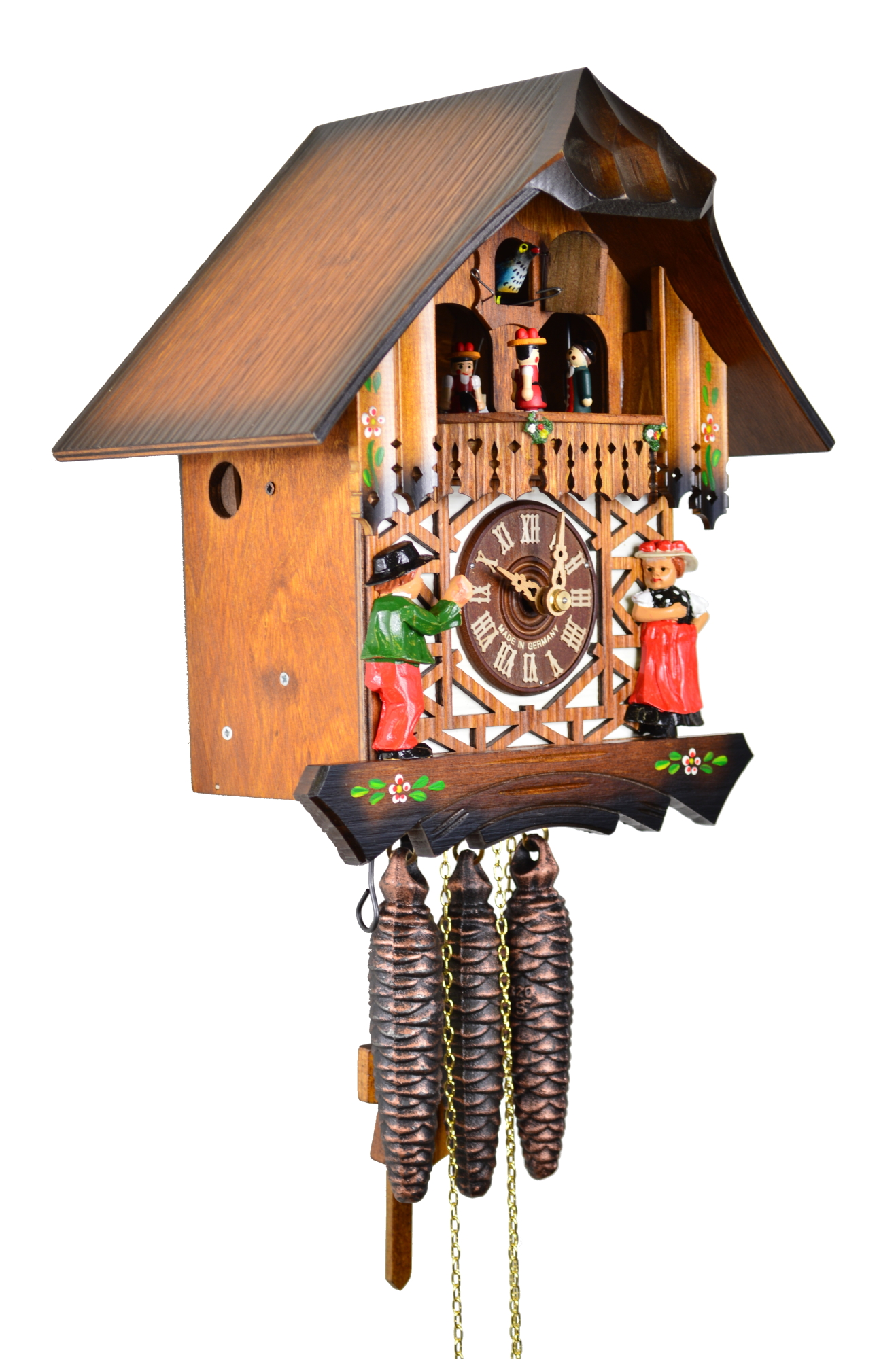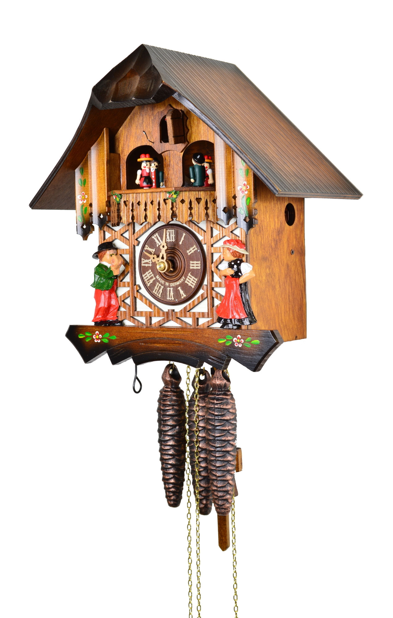 Maße: 29cm hoch, 16cm breit, 18cm tief, (gemessen höchster Punkt Dach bis unterster Punkt Schnitzerei); mit 2 x 1260g Gewichten,