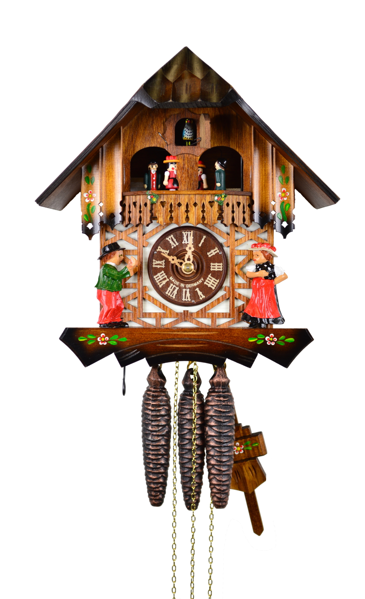 Dieses schöne Alpenchalet zeigt eine alpentypische Szene. Rechter Hand sitzt ein Biertrinker auf einer Bank. Mit dem Schlag der Uhr hebt er sein Glas zum Mund. Linker Hand steht ein Musikant mit einem großen Alphorn. Aus dem Schornstein kommt mit dem Schlag der Uhr ein Schornsteinfeger.
