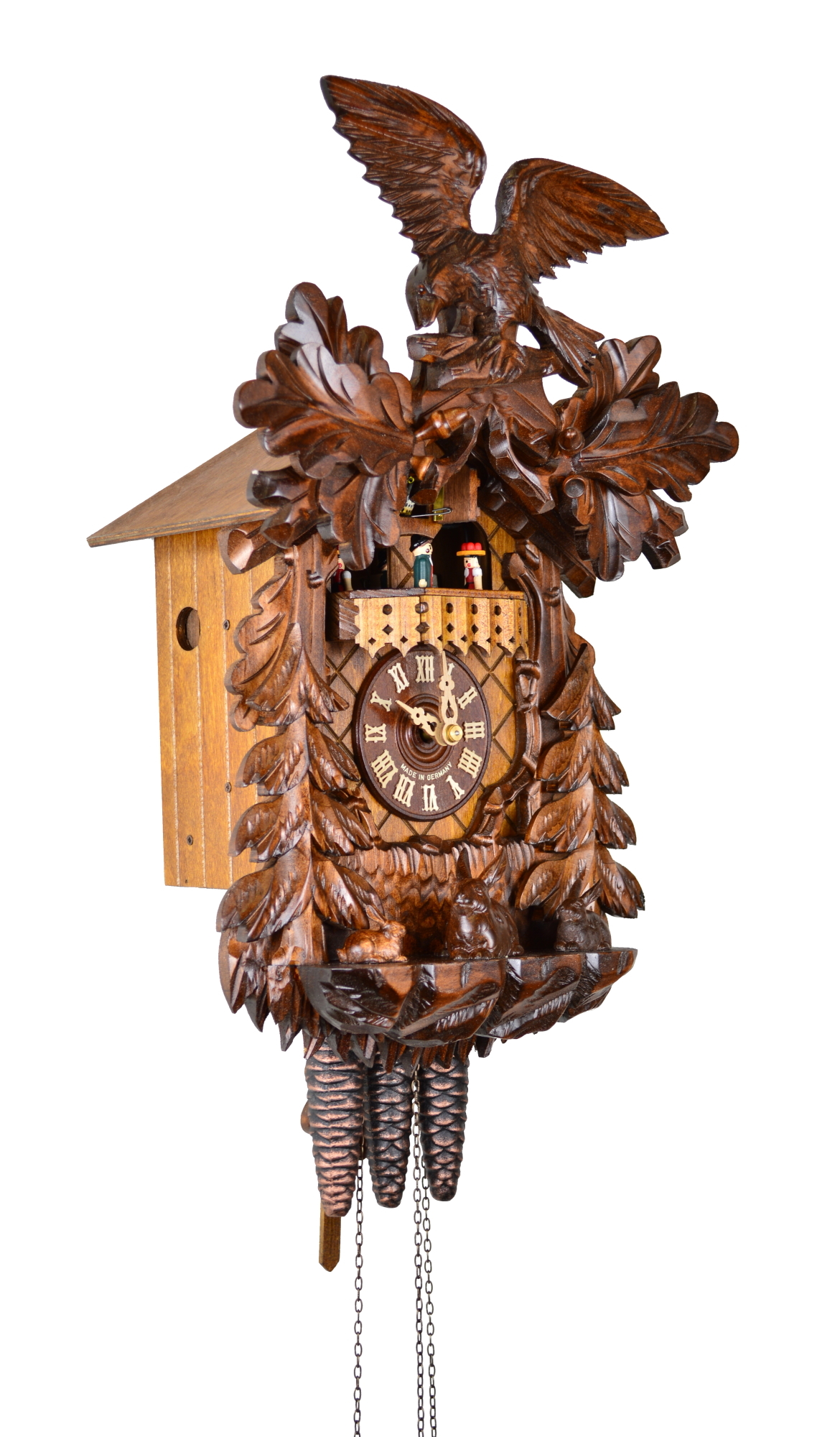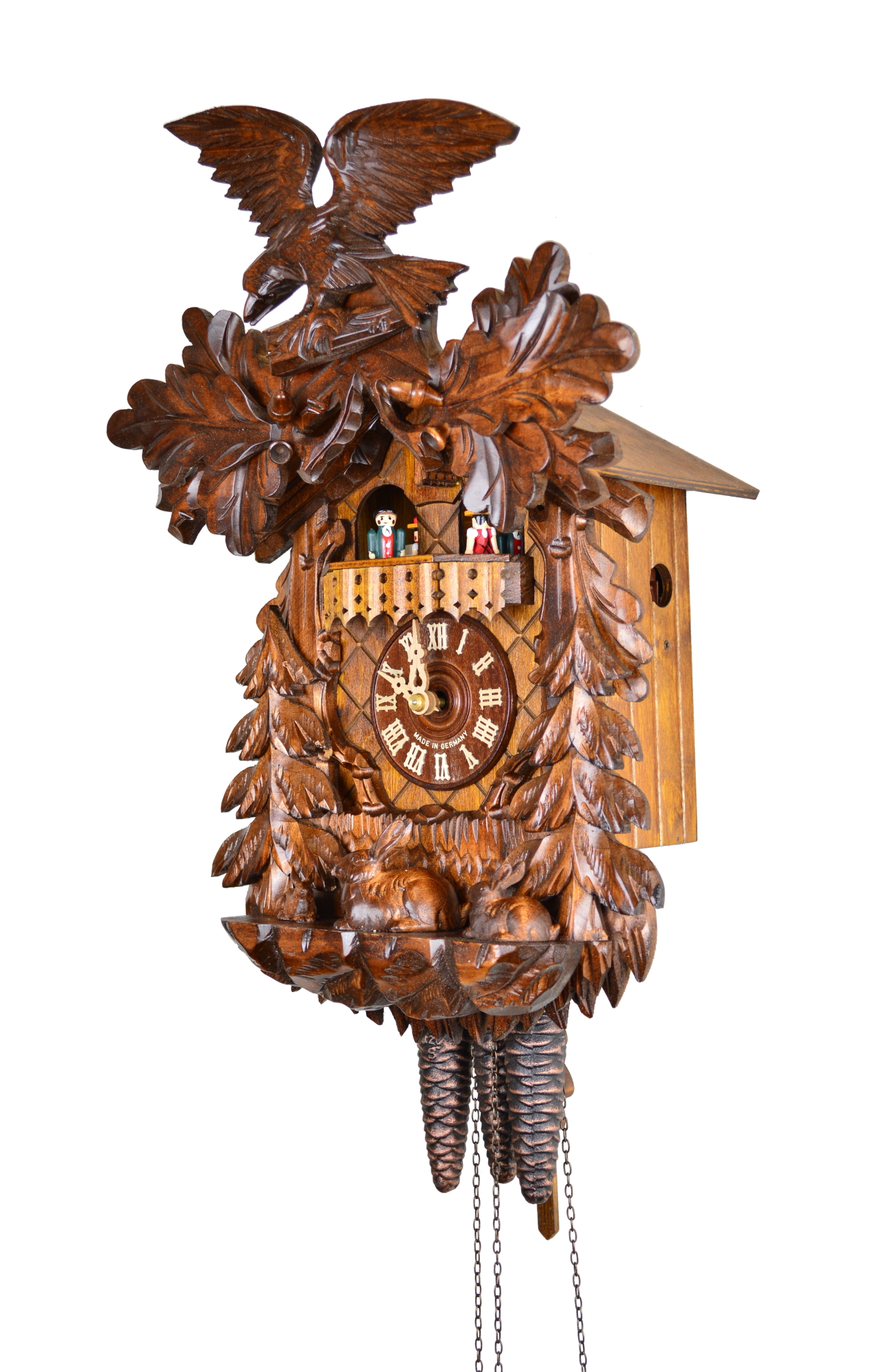 Dies ist eine Chalet-Uhr Variante einer Biertrinker-Uhr mit zwei Bauern die ihr Feierabendbier trinken. Es sitzen zwei Biertrinker an einem Tisch, ruft der Kuckuck, heben beide das Bierglas zum Mund. Linker Hand erscheint ein kleines Reh auf der Waldlichtung. Flankiert wird das Ganze mit einer schönen Schwarzwaldtanne. Das Mühlrad zur Linken dreht sich ebenfalls mit dem Spielen der Musik. Sehr schönes Fachwerkhaus, Dach in Strohdachoptik geschnitzt.