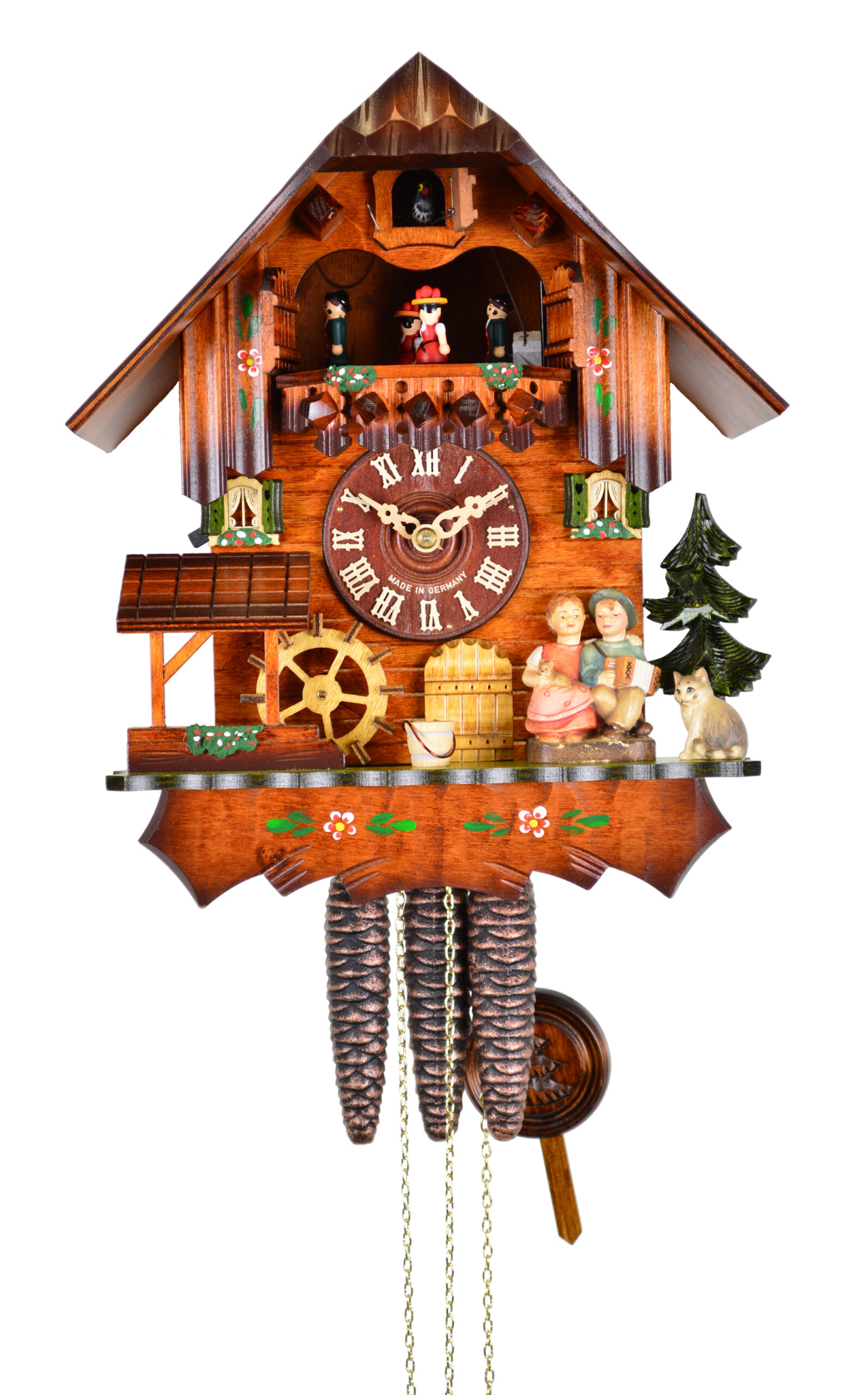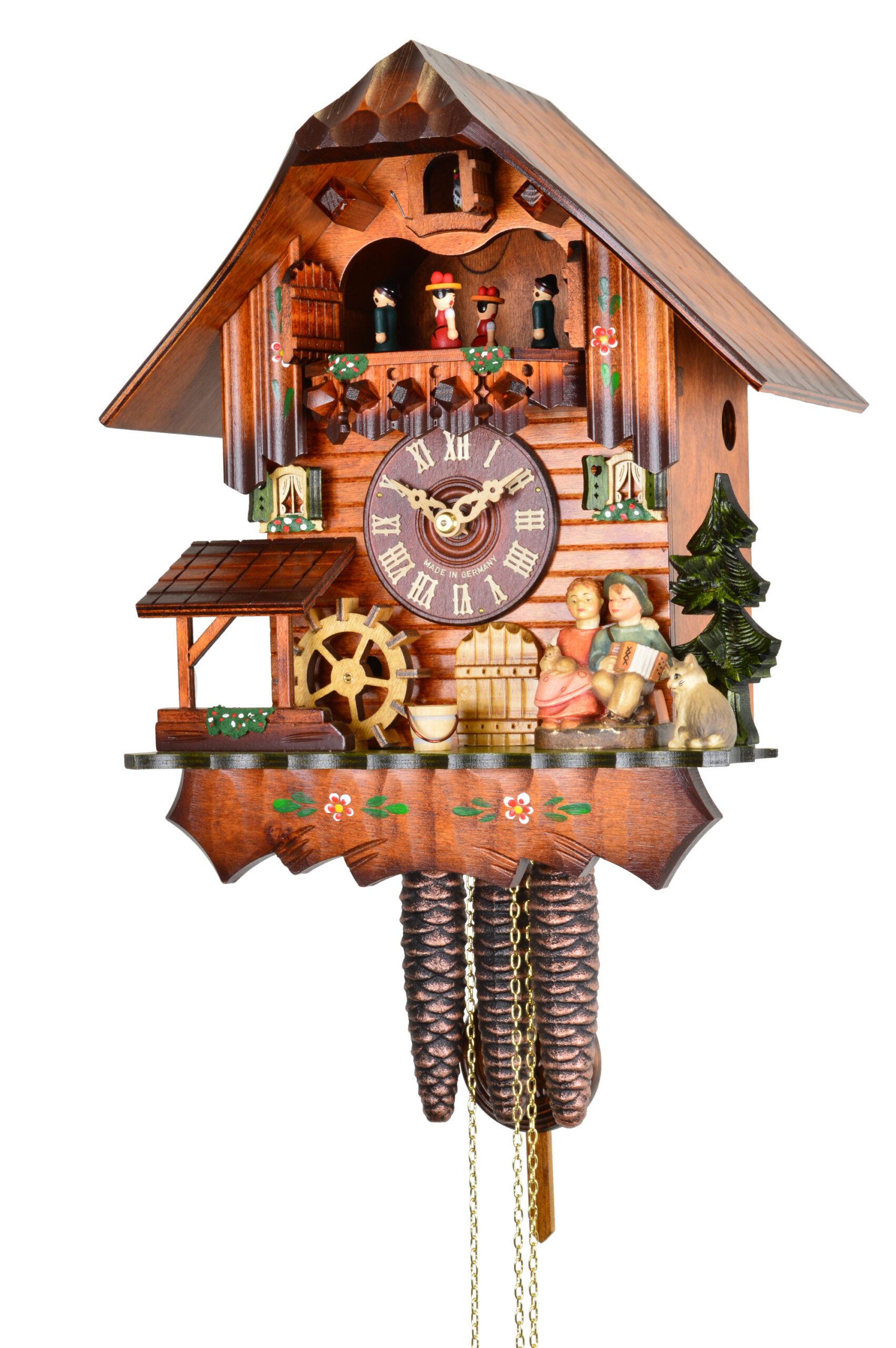 Dieses wunderschöne Chalet zeigt eine romantische Hüttenszene mit einem Paar auf einer Bank, das sich zur vollen Stunde küsst. Das Paar dreht mit dem Ruf des Kuckucks die Köpfe zueinander, in Imitation eines Kusses. Neben dem Liebespaar beobachtet eine Katze die Szene. Das Mühlrad zur Linken dreht sich ebenfalls mit dem Erklingen der Musik.