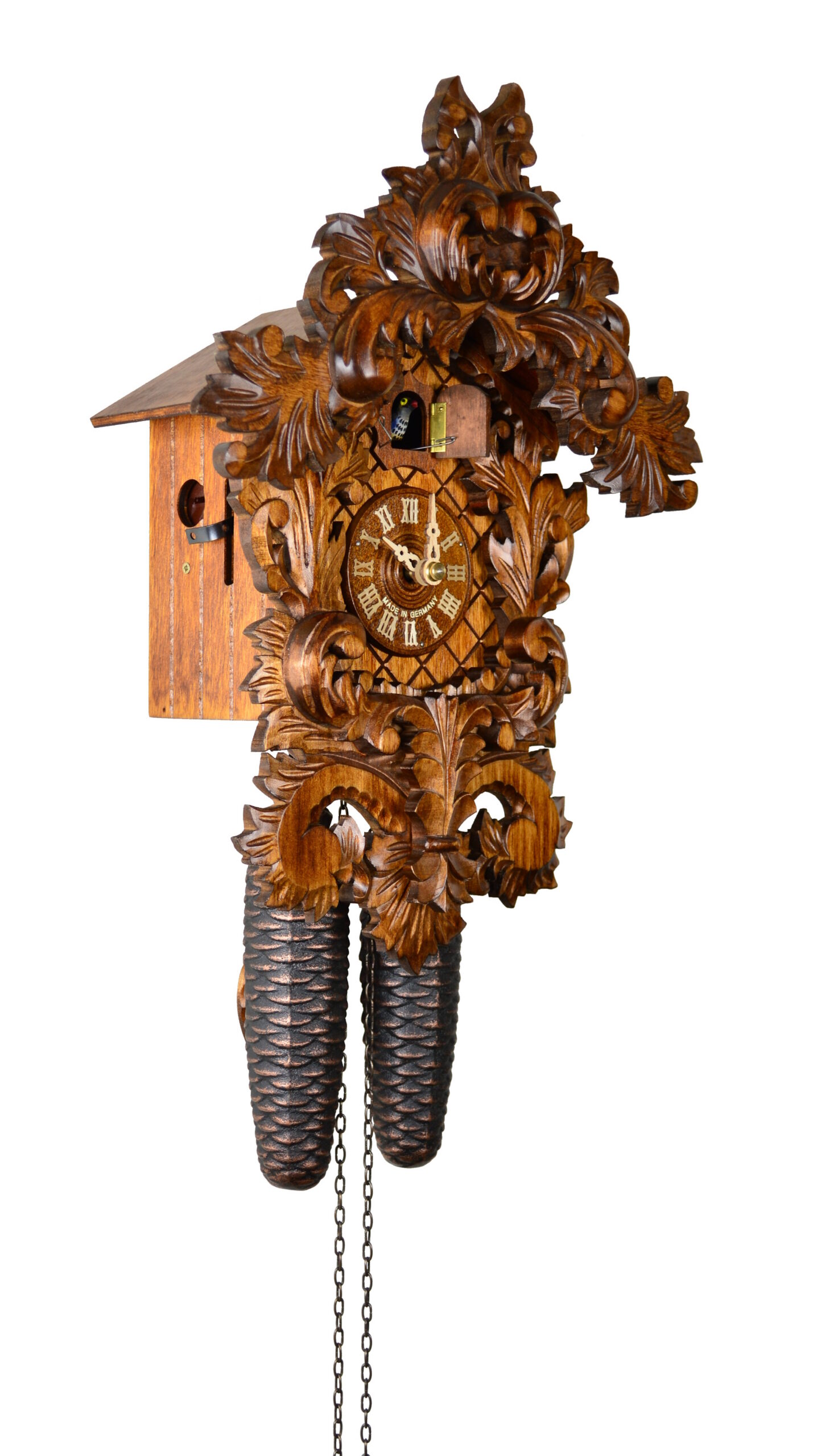 Ausschließlich handgeschnitzt ohne maschinelle Unterstützung. Viele Elemente aus Massivholz geschnitzt. Messingscharnier beim Türchen vom Kuckuck. Ketten galvanisiert in Antikoptik. Nachtabschaltung mit Holzknopf.