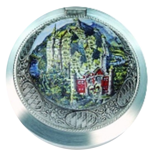 A cut glass “crystal” has been set into the genuine pewter lid, which reveals a picture of the royal castle of Neuschwanstein when viewed from above.