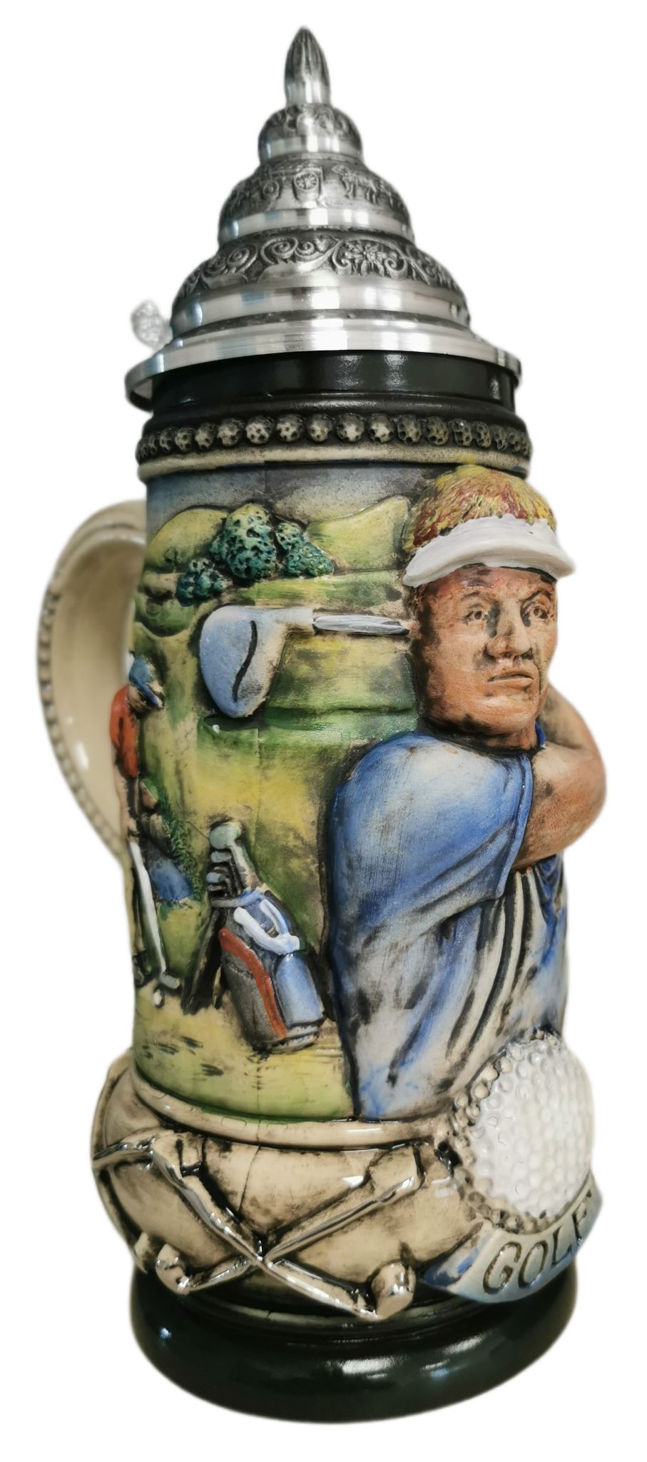 Golfer Krug, handbemalt, 1/2 Ltr., Zinndeckel