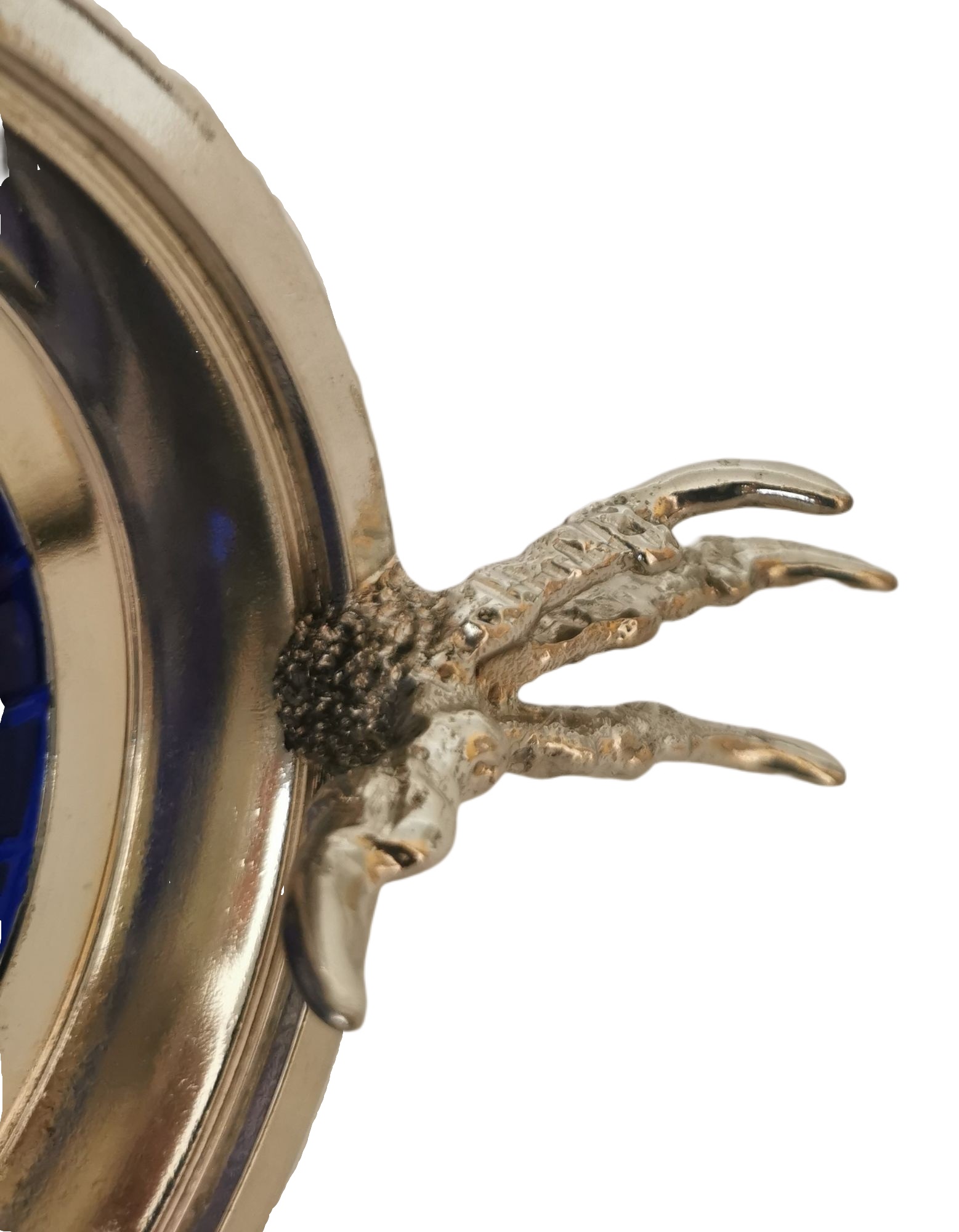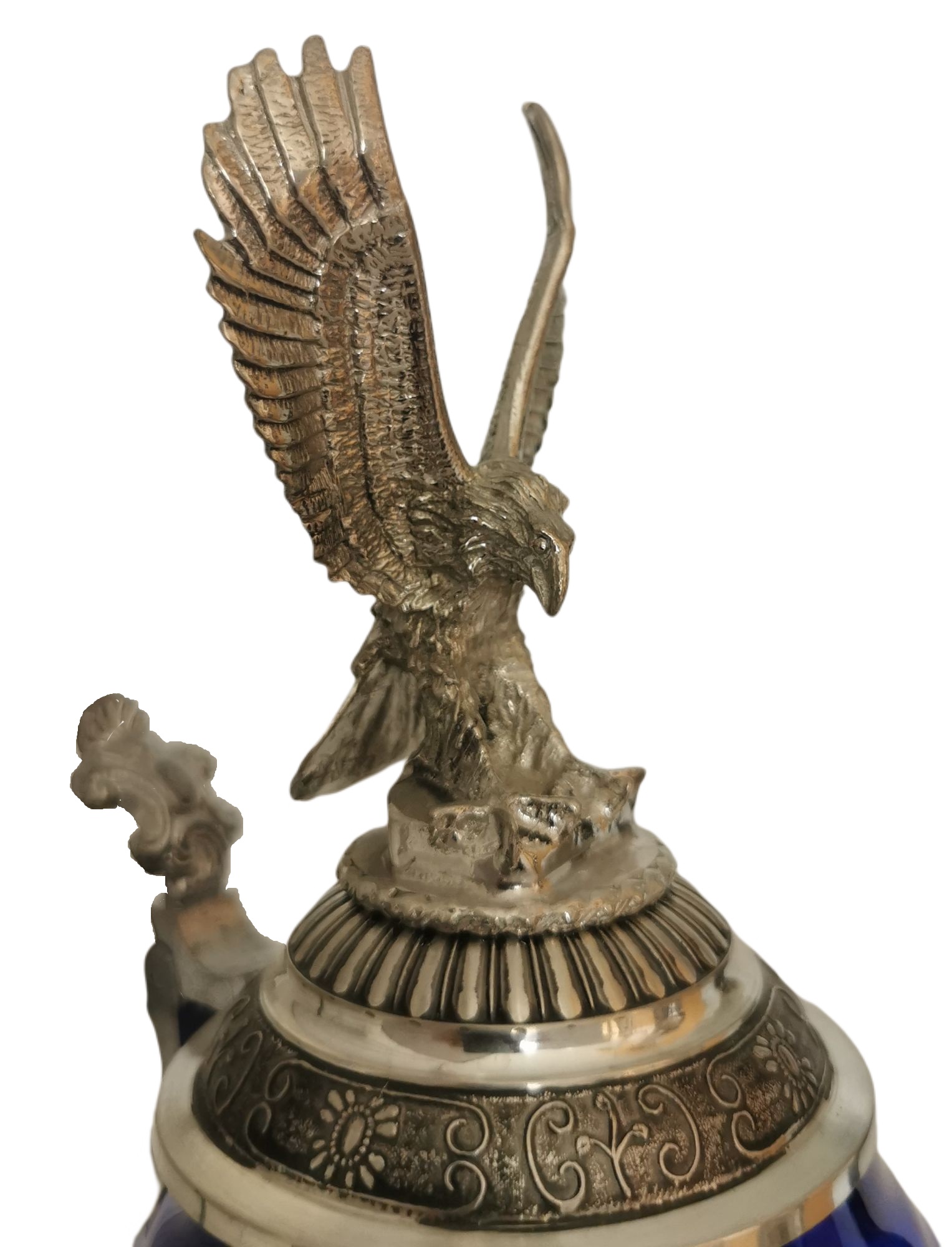Zinnfuss, Adlerkopf und der Deckel mit landendem Adler wurden jeweils in mehreren Teilen separat gegossen, mit größter Sorgfalt per Lötarbeit miteinander verbunden, gedunkelt und poliert.