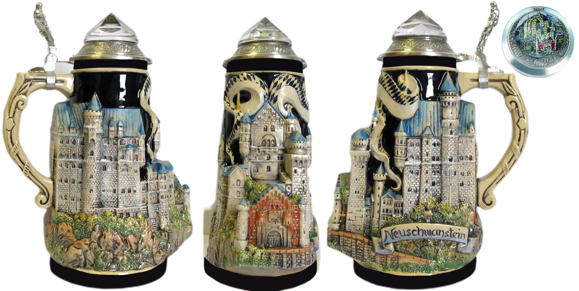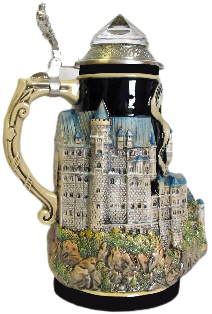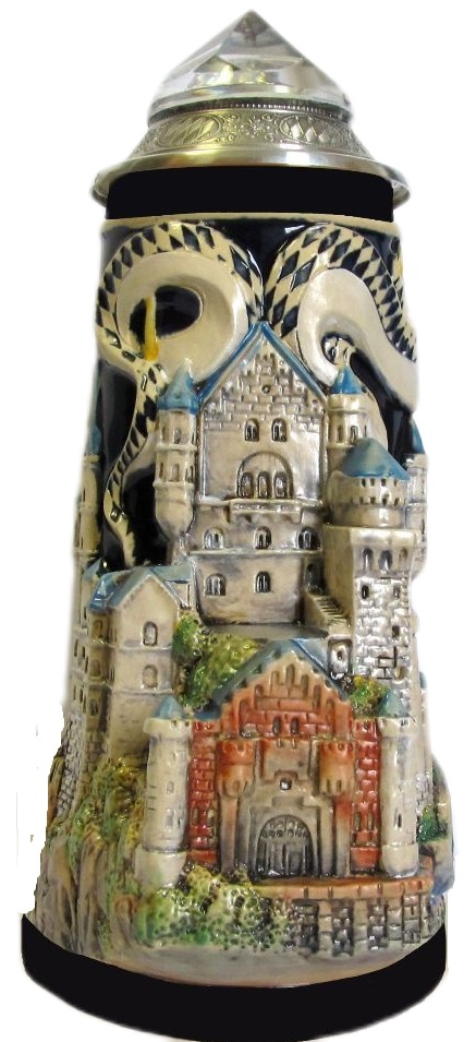 Dieser „figürliche“ und von einer „normalen“ Krugform abweichende Neuschwanstein-Krug zeigt das Königsschloss Ludwigs von Bayern in all seiner Schönheit.