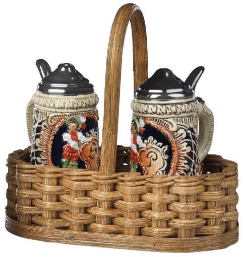 Salz- und Pfefferstreuer, bemalt, im Holzkörbchen